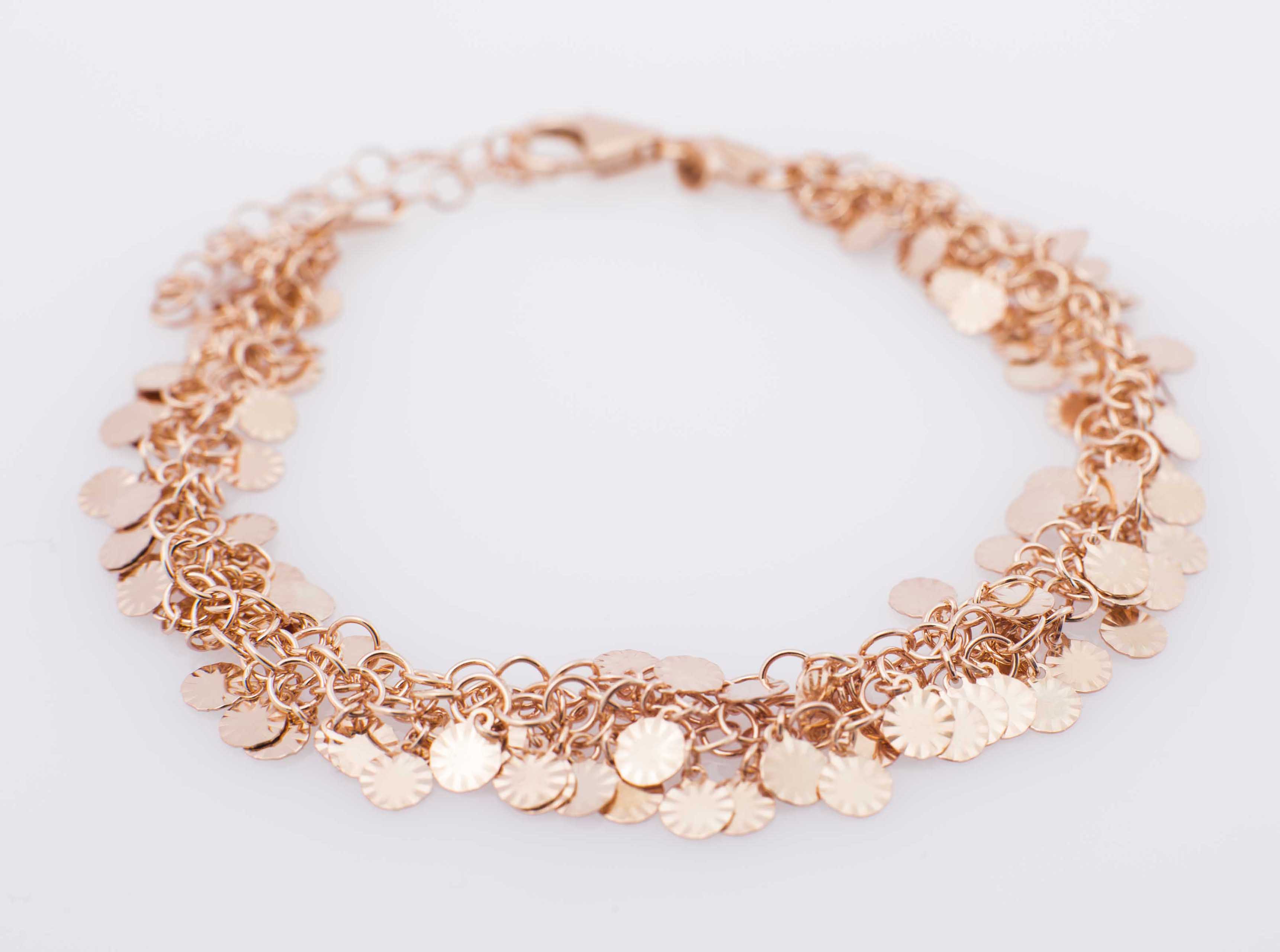 Bracciale in argento, colore Rosé, composto da 3 file intrecciale di catena ad anellini con dischetti disegnati rodondi pendenti.