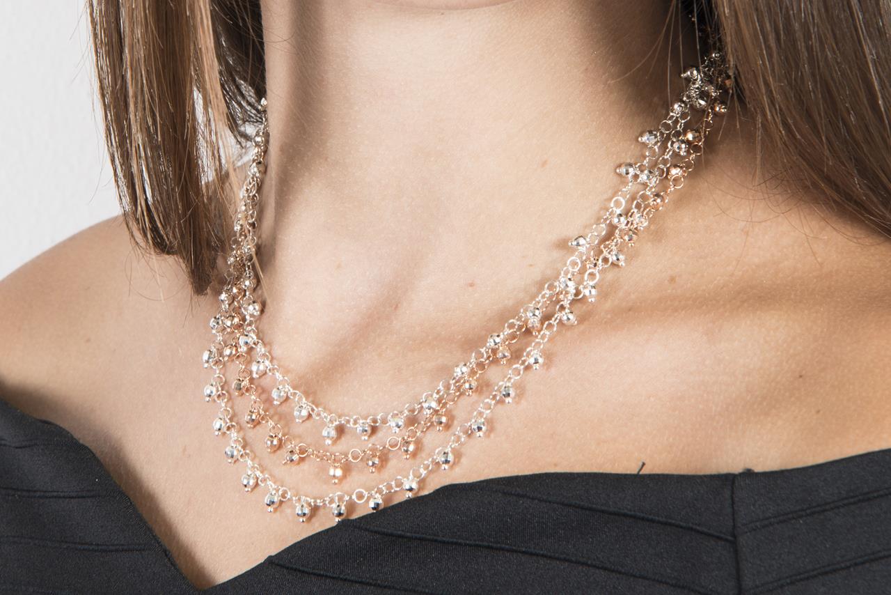 Silver necklace 3 lines graduated with diamond beads. Silver and Pink plated.